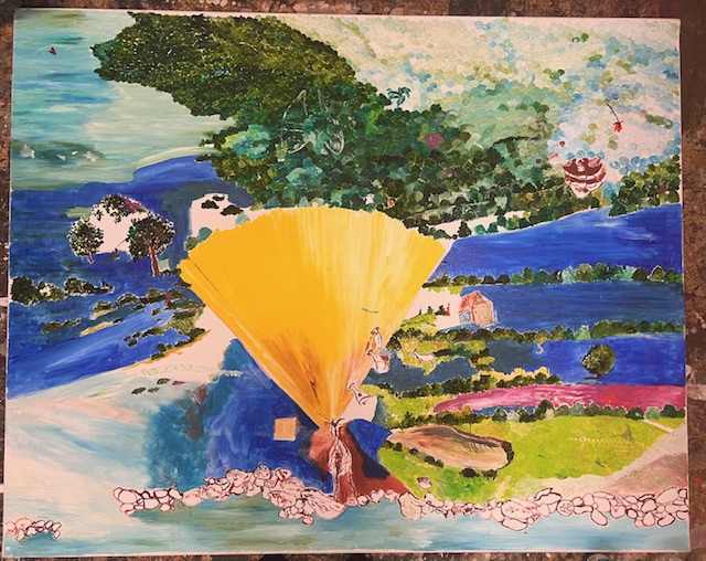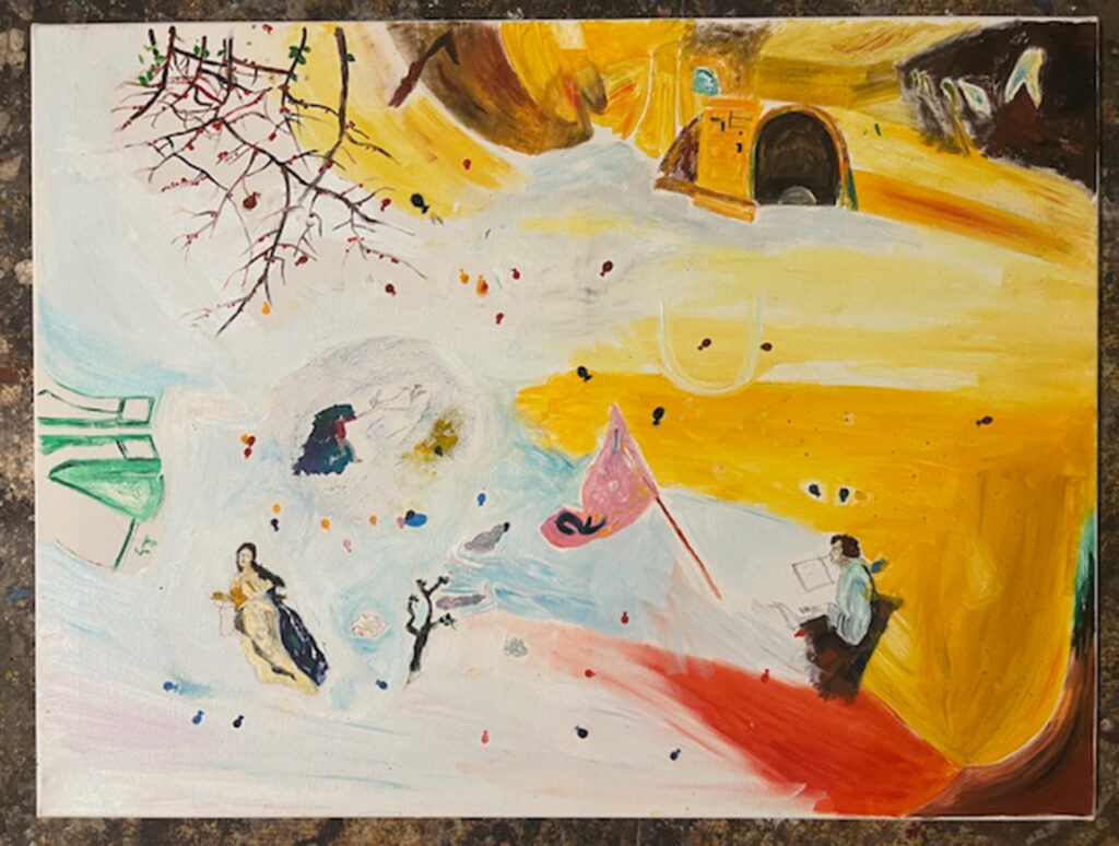 „Chopin tries to reach the queen and the baloon party is going on“; oil on canvas; 0,60×0,80m; 2025